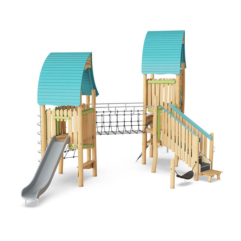 The Wizard’s Double Tower Fortress is an irresistible play attraction for children. With its varied play corners and diverse physical play activities it attracts children again and again, for a long time. The stairway with hammock makes a nice haven for children of all abilities.